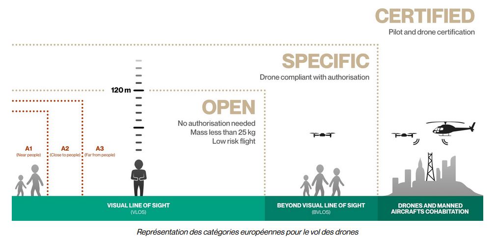 L’EASA a défini 3 types de catégories d’opérations en fonction du niveau de risque. Le pilote de drone devra donc déterminer dans laquelle de ces opérations il fera évoluer son drone, et se conformer aux règles associées :